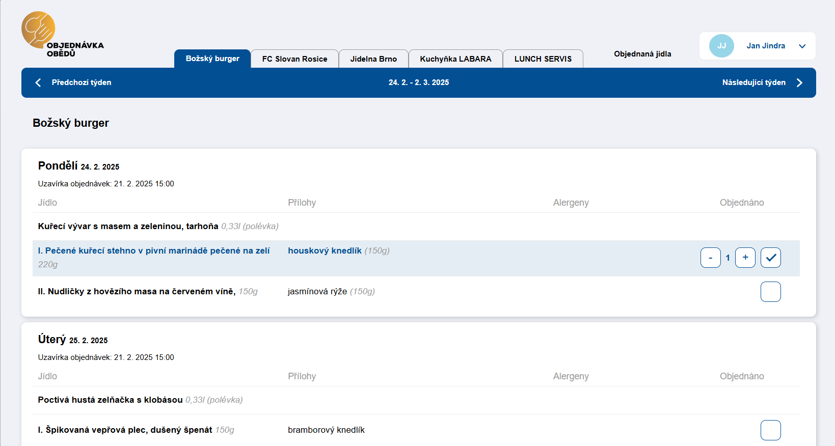 Objednání jedním klikem - strávník si vybere jídlo a zaškrtne jej - není třeba dále nic potvrzovat. Objednává jídlo rovnou na celý týden.