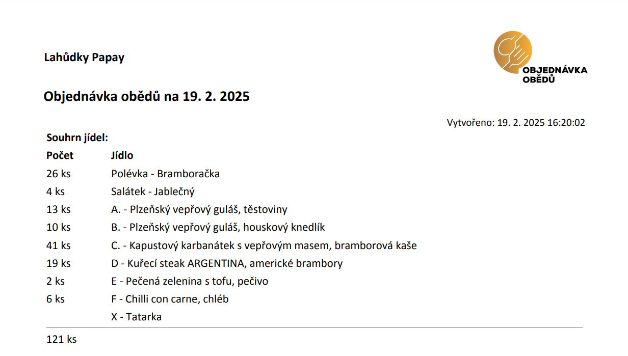 Objednávky systém odevzdá v stanovený čas hromadnou objednávkou dodavateli stravy například do e-mailu